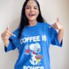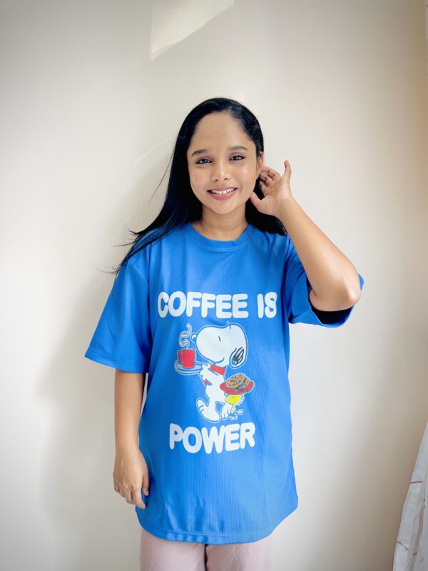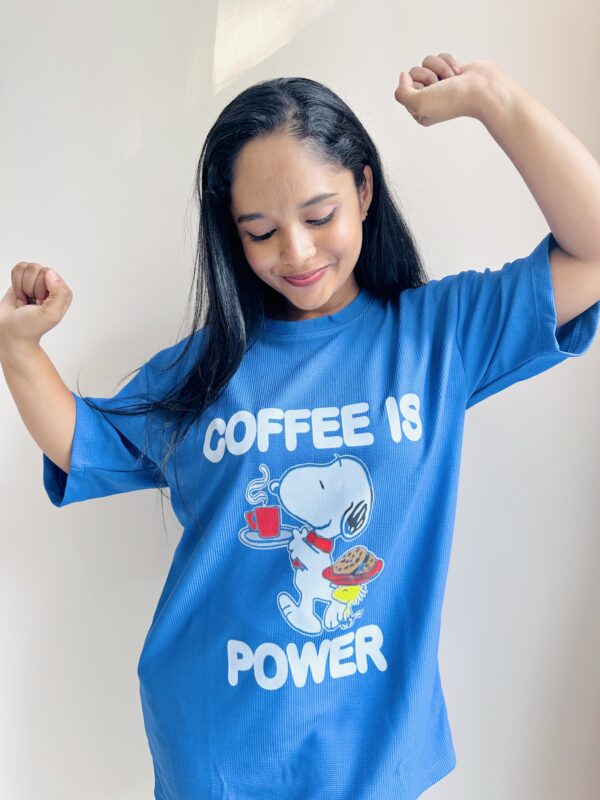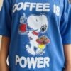 Fuel your day with fun in our Coffee Power Snoopy waffle tee! This vibrant blue t-shirt in our signature waffle knit features Snoopy with his essential coffee and cookie. It’s a cute and quirky way to express your love for a good brew. Oversize Fit Tshirt